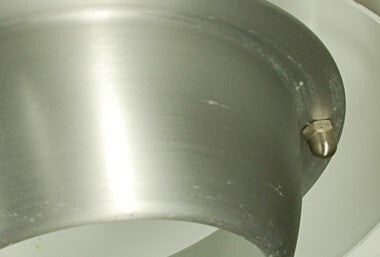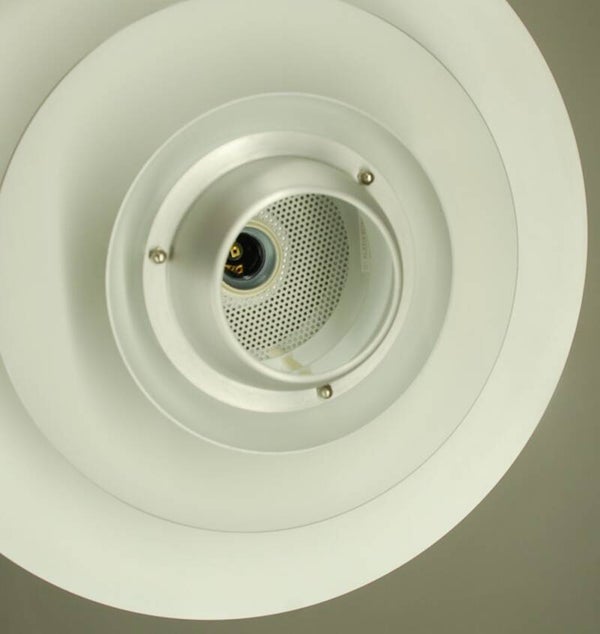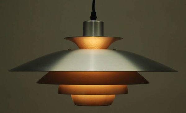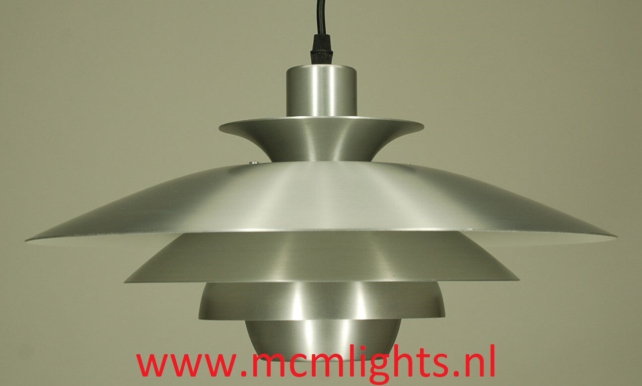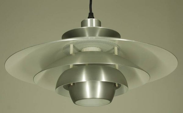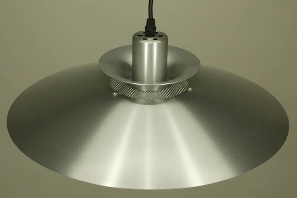 In very good authentic condition, brushed aluminum hanging lamp by Jeka metalryk, Denmark, 1990's.