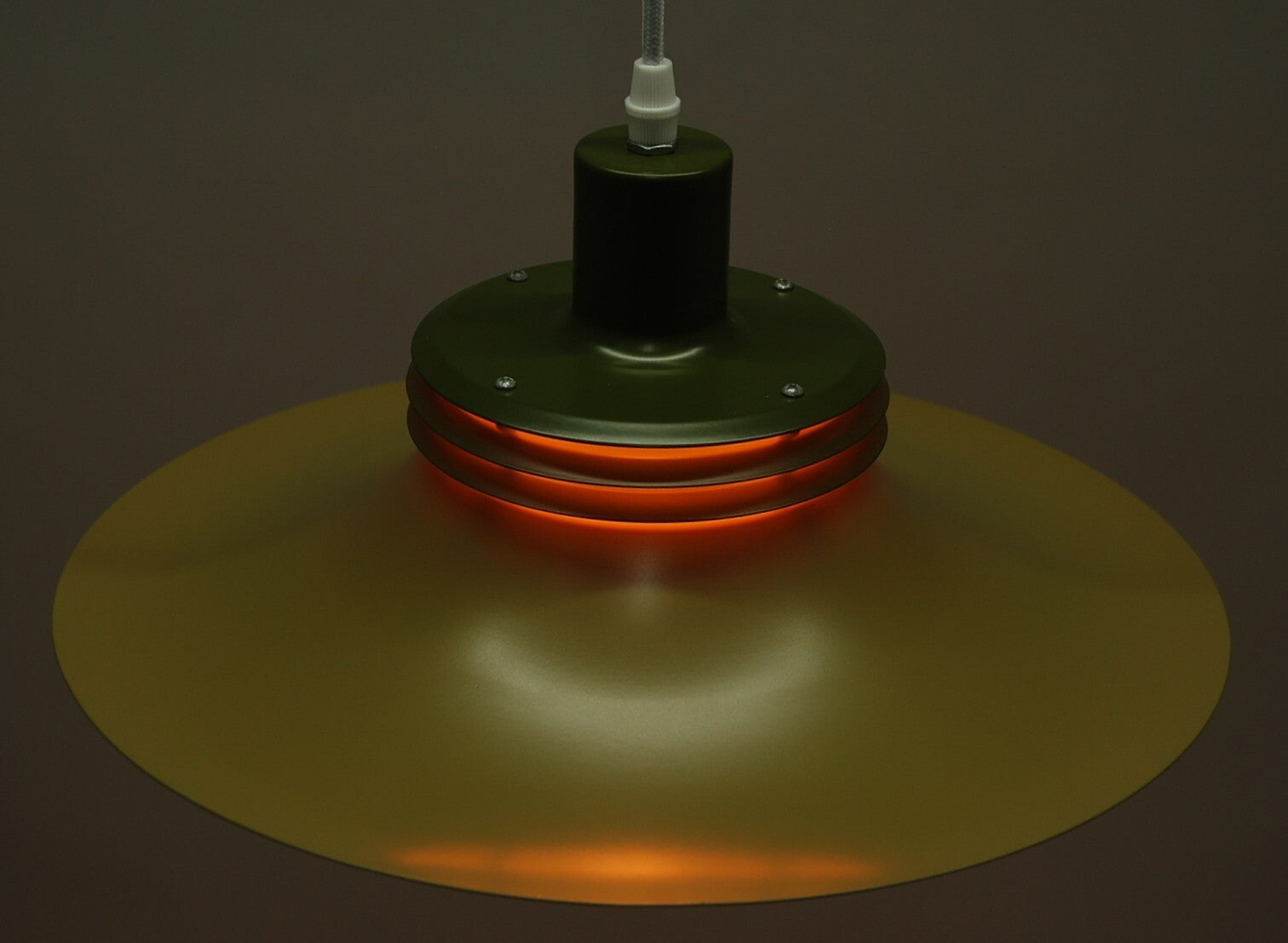 In good condition, a refurbished pendant lamp with an olive green exterior and an orange to beige interior, of which the manufacturer is unknown.