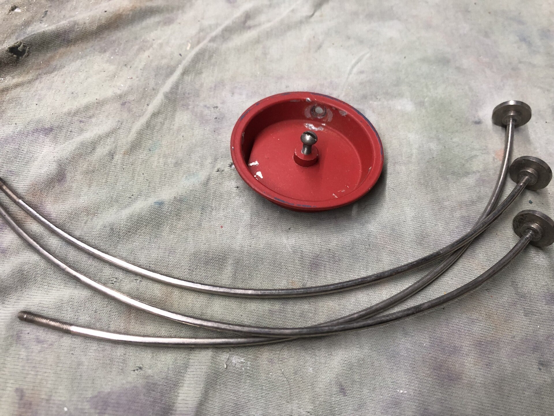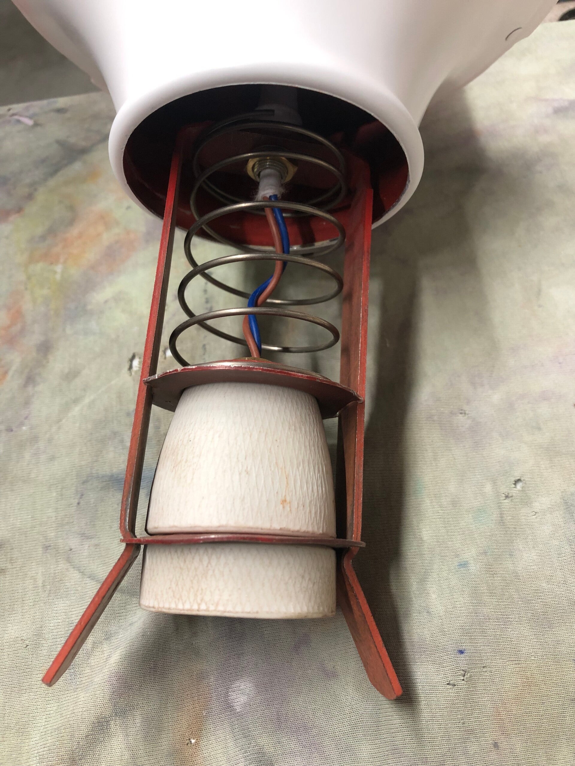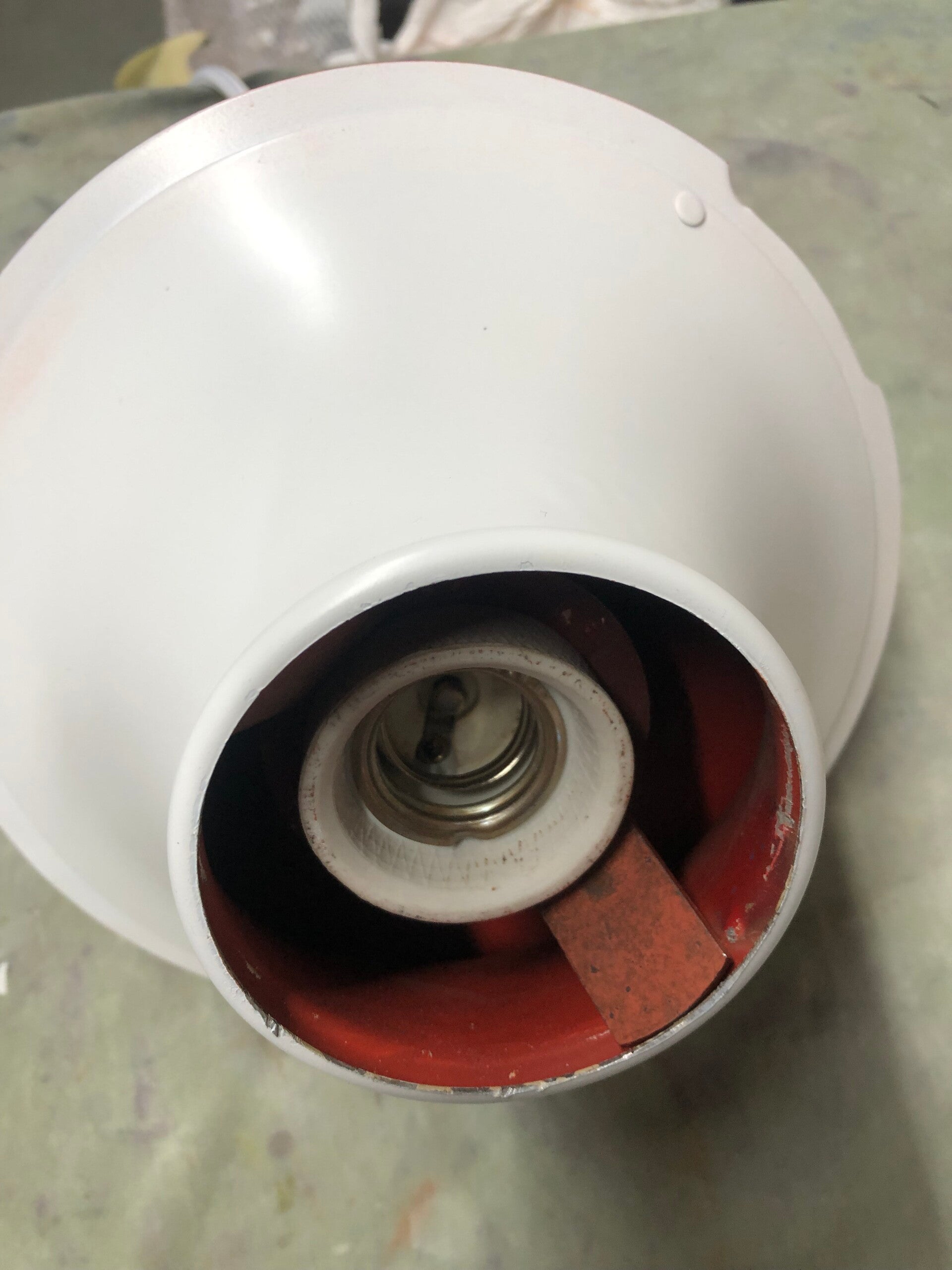 Indications of age: the most striking feature is the spring mechanism of the fitting, which was only used in the early 1960s and dates back to the 1930s when it was applied in other Louis Poulsen models. Furthermore, steel threaded studs, which later became copper and brass, and the beautiful ball-head bolt, which later became a Parker screw. In the old models, the lower part, like the rest of the lamp, is still made of aluminium, this later became a steel shade.